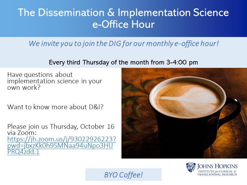Do you have questions about implementation science in your own work? Are you curious about Dissemination & Implementation (D&I) best practices? The Dissemination & Implementation Group (DIG) invites you to our monthly virtual e-Office Hour, a space to swap ideas, troubleshoot challenges, and connect with peers.